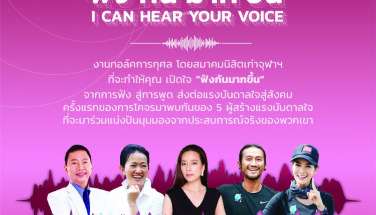 สมาคมนิสิตเก่าจุฬาฯ (สนจ.) จัดงานทอล์ค “ฟังกันมากขึ้น I can hear your voice” ดึงคนดังในหลายสาขาร่วมแชร์ประสบการณ์ เพื่อสร้างความเข้าใจกันในสังคม รายได้หลังหักค่าใช้จ่าย นำไปสนับสนุนการผ่าตัดโรคหูน้ำหนวกให้ผู้ป่วยชนบทของมูลนิธิ หู คอ จมูก ชนบท และกิจกรรมสาธารณกุศลของ สนจ.