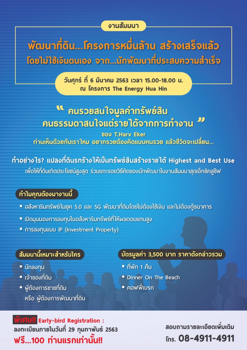 จากการพัฒนาที่ดิน งานสัมมนา “พัฒนาที่ดิน โครงการหมื่นล้าน สร้างเสร็จแล้ว โดยไม่ใช้เงินตนเอง จาก…นักพัฒนาที่ประสบความสำเร็จจริง” เป็นคำตอบของคุณ!!