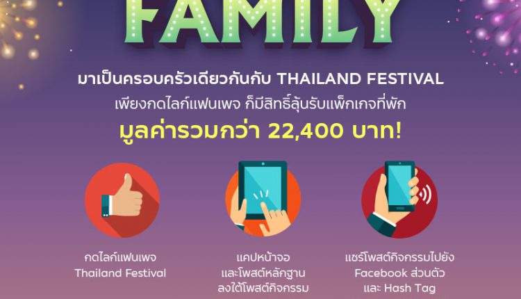 การท่องเที่ยวแห่งประเทศไทย ขอเชิญชวนคนไทยมาร่วมเป็นครอบครัวเดียวกัน ในโครงการ Thailand Festival Family ด้วยการส่งผ่านข้อมูลและกิจกรรมดีๆ ของการท่องเที่ยวไทย บนแฟนเพจ Thailand Festival เพียงกดไลก์ และแชร์ก็จะสามารถแบ่งปันข้อมูลกิจกรรมท่องเที่ยวดีๆ ให้กับเพื่อนๆ แถมยังมีสิทธิ์ได้ลุ้นรางวัลพิเศษจากโครงการ