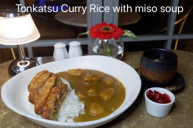 เมนูแรกวันนี้คือ 1. Tonkatsu Curry Rice with miso soup 350 Baht