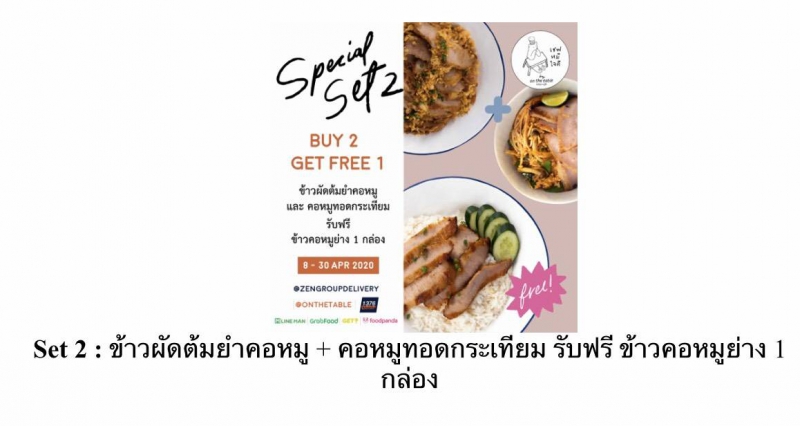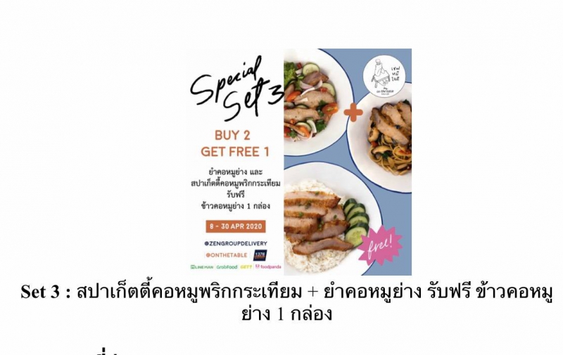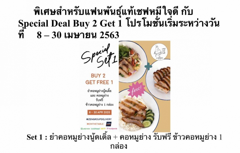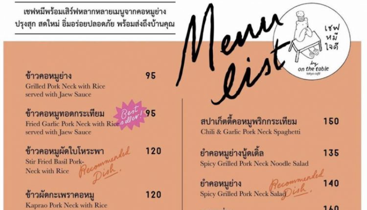 On the Table, Tokyo Cafe”(ออน เดอะเทเบิ้ล โตเกียว คาเฟ่) ร้านอาหารสไตล์โตเกียวคาเฟ่ จัดแคมเปญ “เชฟหมีใจดี” เอาใจคนรักคอหมู พร้อมเสิร์ฟความหลากหลายเมนูจากคอหมูย่าง มีทั้งเมนูข้าว, สปาเก็ตตี้ และยำต่าง ๆ รวม 12 เมนู นอกจากนี้ยังสามารถเพิ่ม Toppings ไข่ได้อีก ไข่เจียว ไข่มะตูม ไข่ดาว หรือจะเพิ่มข้าวสวยร้อน ๆ ก็ยังได้พร้อมเสิร์ฟให้คุณในราคามิตรภาพ ใช้วัตถุดิบชั้นดี ปรุงสุกใหม่ตามมาตรฐานของ On the Table พร้อมเดลิเวอรี่…ความสุขบนโต๊ะที่บ้านคุณแล้ว ผ่าน Line @onthetable @zengroupdelivery, Zen Delivery 1376 หิวแล้ว สั่งเลย หรือสั่งอาหารผ่านแอพพลิเคชั่น LineMan, GrabFood, GET, และ FoodPanda
