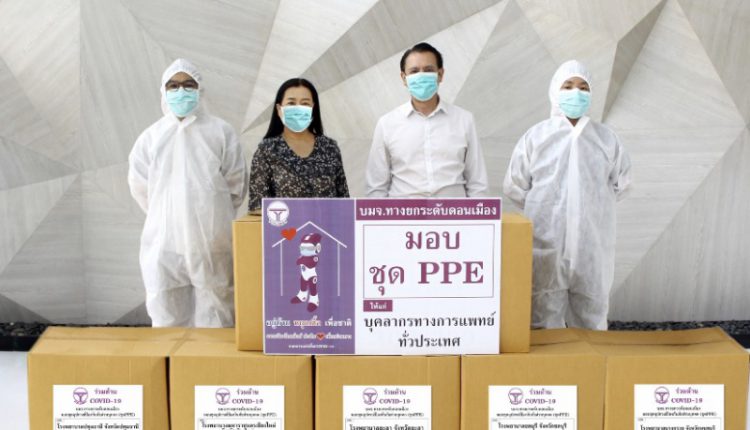 คุณธานินทร์ พานิชชีวะ กรรมการผู้จัดการ และ คุณอัจฉรา เจริญพร ผอ.ฝ่ายทรัพยากรมนุษย์และสื่อสารองค์กร บมจ.ทางยกระดับดอนเมือง มอบชุดอุปกรณ์ป้องกันภัยส่วนบุคคล (PPE) เพื่อส่งต่อให้บุคลากรทางการแพทย์