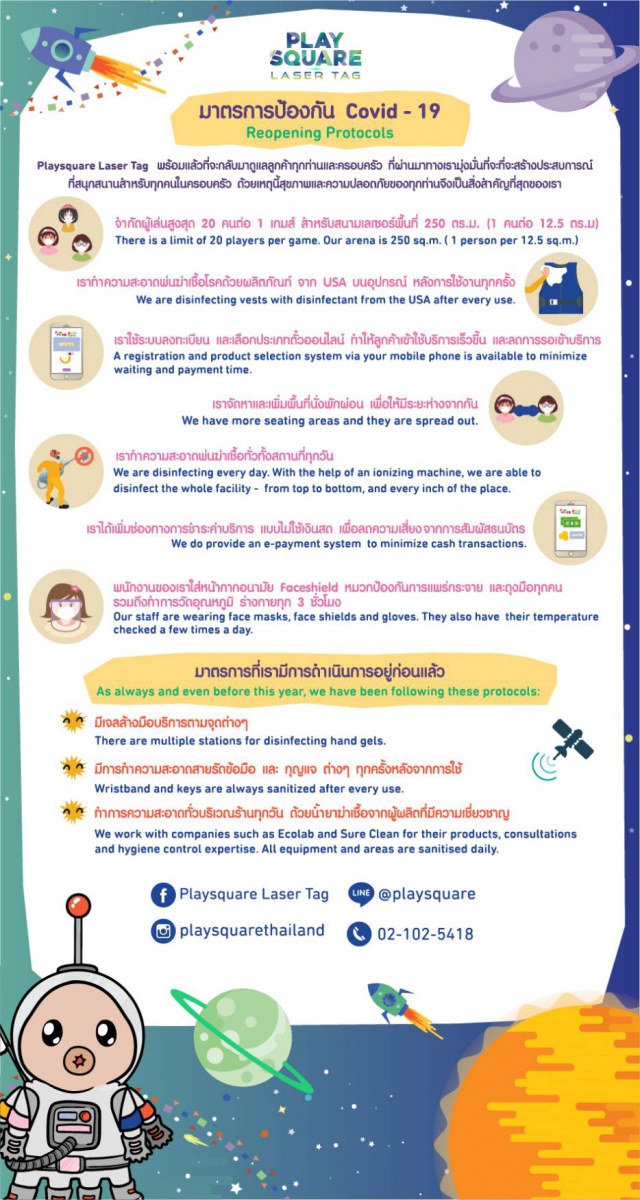 ด้านมาตรการบริเวณพื้นที่ ‘เพลย์สแควร์ เลเซอร์ แท็ก’ (Playsquare Laser Tag) พนักงานจะทำความสะอาดอุปกรณ์ทุกครั้งหลังการใช้งาน เพื่อให้ผู้เล่นรอบต่อไปได้มั่นใจถึงความสะอาดและความปลอดภัยที่จะได้รับ และยังมีมาตรการจำกัดจำนวนผู้เล่นทำให้ไม่เกิดความแออัดบริเวณพื้นที่เล่นเกมอีกด้วย
