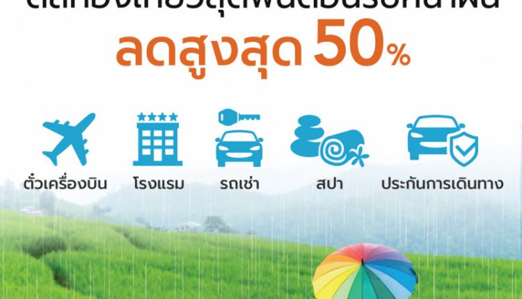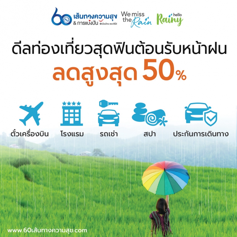 ชวนคนไทยแพ็คกระเป๋าออกเดินทางตามหาความสุขที่มากับสายฝน พร้อมจัดโปรโมชั่น ที่พัก บัตรโดยสาร แพ็กเกจทัวร์ รถเช่า สปา กิจกรรม ในราคาสุดพิเศษให้คนรักฝนออกเดินทางเที่ยวเมืองไทยให้หายคิดถึง