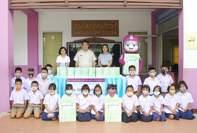 น.ส.อัจฉรา เจริญพร ผู้อำนวยการฝ่ายทรัพยากรมนุษย์และสื่อสารองค์กร บมจ.ทางยกระดับดอนเมือง และน.ส.ภัทรา โมรา ผู้ช่วยผู้อำนวยการด้านการตลาด ศูนย์การค้าฟิวเจอร์พาร์ครังสิต มอบสมุด Green Way ให้กับ ดร.สมชาย สังข์สี (แถวยืนที่ 2 จากซ้าย) ผู้อำนวยการ รร.ทองพูลอุทิศ อ.ธัญบุรี จ.ปทุมธานี
