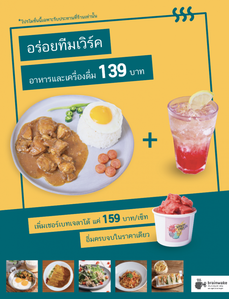กะเพราไก่ไข่กระทะนิมิตร / สปาเก็ตตี้โบโลเนส / สลัดทูน่า / ข้าวหน้าไก่ทรงเครื่อง พร้อมกับเครื่องดื่มไทยโซดา และ BrainFreeze เจลาโต้ เชอร์เบท (เฉพาะรับประทานที่ร้านเบรนเวค สาขาสัมมากรเท่านั้น)