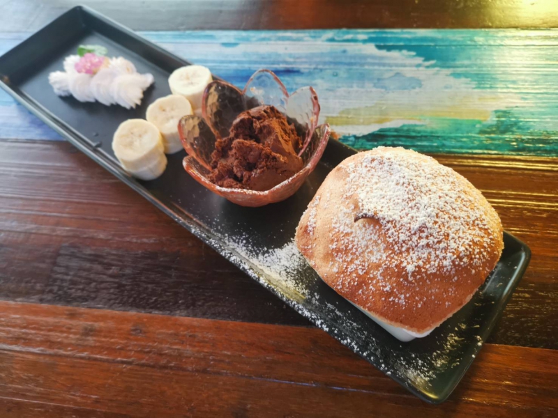 ซุเฟล่กล้วยเสิร์ฟมากับไอศครีมช็อคโกแลตโฮมเมด กินเคียงไปกับกล้วยหอมสด อร่อยหอมหวานค่ะ