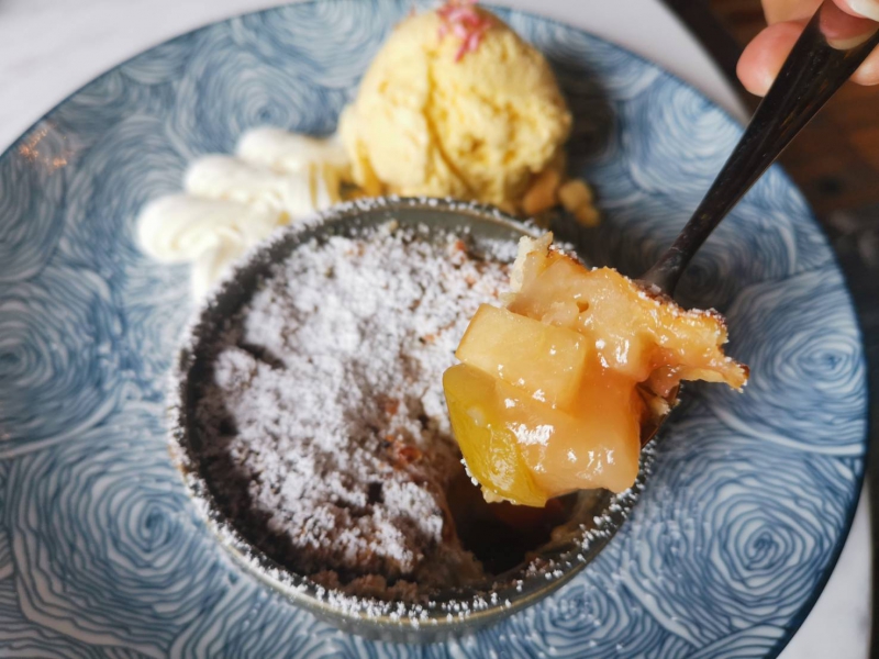 คอบเบลอร์แอปเปิ้ลเสาวรสเสิร์ฟมาร้อน กินคู่กับไอศครีมมะม่วงเย็นๆ อร่อยชื่นใจค่ะ