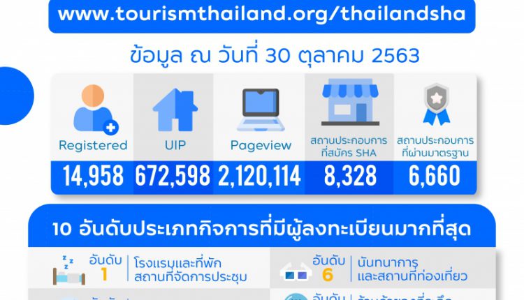 ซึ่งปัจจุบัน มีผู้ประกอบการด้านการท่องเที่ยวจากทั่วประเทศเข้าร่วม โครงการ SHA จำนวน 14,958 ราย ( ข้อมูล ณ วันที่ 30 ตุลาคม 2563 ) ซึ่งเกินกว่าที่ ททท. ได้ตั้งเป้าหมายไว้ สำหรับผู้ประกอบการที่สนใจเข้าร่วมโครงการ SHA ที่มีการจัดประเภทการบริการไว้ 10 ประเภทกิจการ จำนวนผู้ประกอบการด้านโรงแรมและที่พักสถานที่จัดการประชุม มีจำนวนที่ได้รับตราสัญลักษณ์ SHA มากที่สุด ถึง 3,501 ราย รองลงมาคือ ผู้ประกอบการประเภทภัตตาคาร / ร้านอาหาร มีจำนวนผู้ที่ได้รับตราสัญลักษณ์ SHA 1,873 ราย และผู้ประกอบการด้านบริษัทนำเที่ยว มีจำนวนผู้ที่ได้รับตราสัญลักษณ์ SHA 1,033 ราย