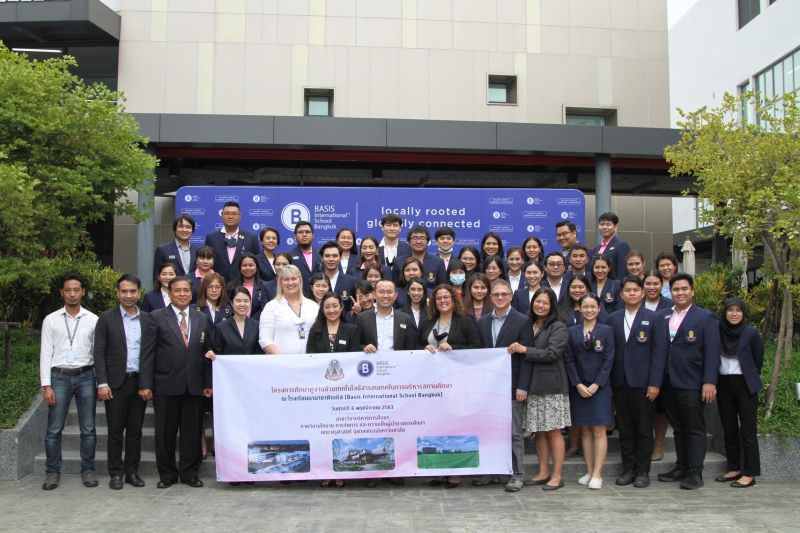 คุณโจนาธาน ชวิมเมอร์ (คนที่ 6 จากขวา) ผู้อำนวยการและผู้ก่อตั้ง พร้อมด้วยคุณอลิซาเบ็ธ ธีส์ ครูใหญ่ (คนที่ 7 จากขวา) โรงเรียนนานาชาติเบซิส กรุงเทพฯ ให้การต้อนรับคณะอาจารย์และนักศึกษากว่า 40 ท่าน จากสาขาวิชาบริหารการศึกษา ภาควิชานโยบายการจัดการและความเป็นผู้นำทางการศึกษา คณะครุศาสตร์ จุฬาลงกรณ์มหาวิทยาลัย เพื่อศึกษาดูงานเทคโนโลยีสารสนเทศ ในการบริหารสถานศึกษา โรงเรียนนานาชาติเบซิส กรุงเทพฯ