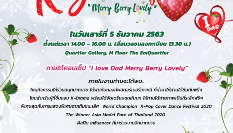 กลับมาเอาใจ สาวกเกาหลีอีกครั้ง กับงานสุดยิ่งใหญ่แห่งปี Merry Berry Lovely K-Strawberry Festival News UpdateWhat's Hot By admin Last updated ธ.ค. 5, 2020 Share Merry Berry Lovely K-Strawberry Festival สถานเอกอัครราชทูตสาธารณรัฐเกาหลีประจำประเทศไทย ร่วมกับกระทรวงเกษตร อาหารและกิจการชนบทแห่งประเทศเกาหลี (Ministry of Agriculture, Food and Rural Affairs) ,กระทรวงการต่างประเทศ (Ministry of Foreign Affairs) และองค์การโคเรีย อะโกร-เทรด เซ็นเตอร์ (aT center) จัดงาน ขึ้นที่ประเทศไทย ซึ่งถือได้ว่าเป็นงานสุดยิ่งใหญ่แห่งปี เพื่อส่งเสริมสนับสนุน และประชาสัมพันธ์สตรอว์เบอร์รี่เกาหลีให้เป็นที่รู้จักกว้างขวางมากยิ่งขึ้น พร้อมทั้งเปิดโอกาสให้ครอบครัว คุณพ่อและคุณลูก ได้ทำกิจกรรมร่วมกัน เนื่องในโอกาส “วันพ่อ” โดยในปีนี้จะจัดขึ้นภายใต้คอนเซ็ป “I love Dad Merry Berry Lovely” ภายในงานพบกับกิจกรรมให้ร่วมสนุกลุ้นรับของรางวัลมากมาย พร้อมขนกองทัพสตรอว์เบอร์รี่มาให้ชิมกันสดๆ อีกด้วย พิเศษสุดกับการแสดงจากทีมชนะเลิศ World Champion K-Pop Cover Dance Festival 2020 “ทีม ABC” พร้อมพบกับแขกรับเชิญ The Winner Asia Model Face of Thailand 2020 “น้องJELLY” และหนุ่มๆ สุดฮอต “TU Boy” ที่จะมาร่วมส่งต่อความสุขกับการแสดงสุดพิเศษ โดยงานจะจัดขึ้นในวันที่ 5 ธันวาคม 2563 ตั้งแต่เวลา 11.00 – 20.00 น. ณ โซนแกลอรี่ ชั้น M ห้างสรรพสินค้าเอ็มควอเทียร์ (Emquartier) Share