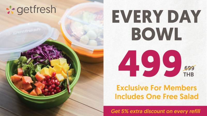 เพียงเป็นสมาชิก Getfresh Rewards สามารถซื้อได้ในราคา 499 บาท จากราคาปกติ 699 บาท (ราคานี้ไม่รวม Vat 7%) สำหรับลูกค้าที่ยังไม่ได้เป็นสมาชิกสามารถสมัครได้ฟรีที่ร้าน Getfresh ทุกสาขา เมื่อลูกค้าซื้อ Getfresh Every Day Bowl รับฟรีสลัดเมนูใด ขนาดใดก็ได้ 1 ที่ (เฉพาะครั้งที่ซื้อ Getfresh Every Day Bowl ครั้งเดียวเท่านั้น) และรับฟรีกระเป๋าผ้า Getfresh Tote Bag 1 ใบ นอกจากนี้ในครั้งต่อไป เมื่อลูกค้านำ Getfresh Every Day Bowl มาใช้สำหรับซื้ออาหารที่ร้าน Getfresh จะได้รับส่วนลดเพิ่ม 5% (เฉพาะเมนูที่ลูกค้าเลือกใส่ในโบลว์)