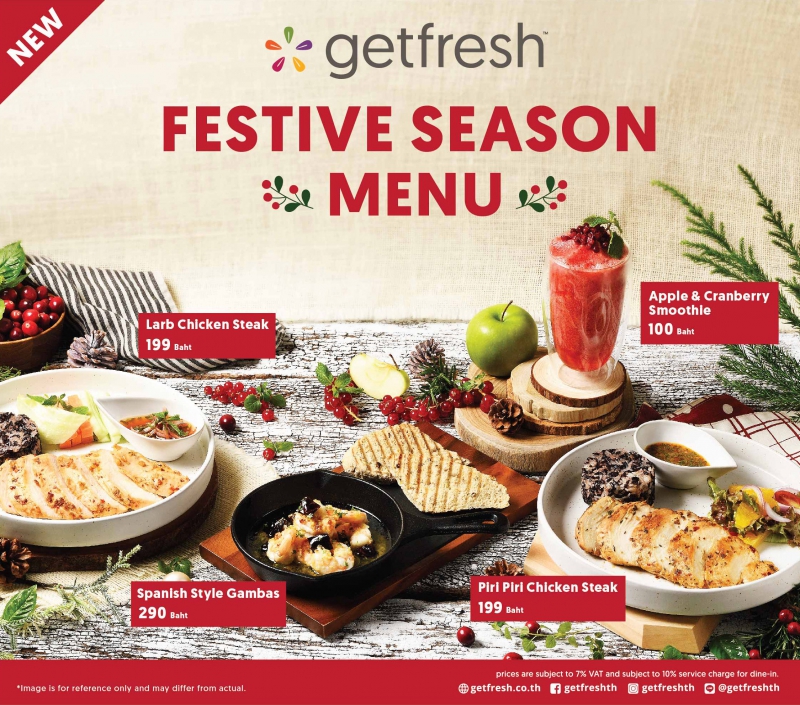 ในช่วงเทศกาลแห่งความสุขนี้ ร้าน Getfresh อยากแบ่งปันความสุขบนโต๊ะอาหารให้กับลูกค้าทุกท่าน กับ Festive Season Menu เมนูอาหารใหม่ที่ทั้งอร่อยและดีต่อสุขภาพ ที่สามารถทานได้ทั้งครอบครัว มาลองรับประทานกันได้นะคะ วันนี้ – 14 มกราคม 2564