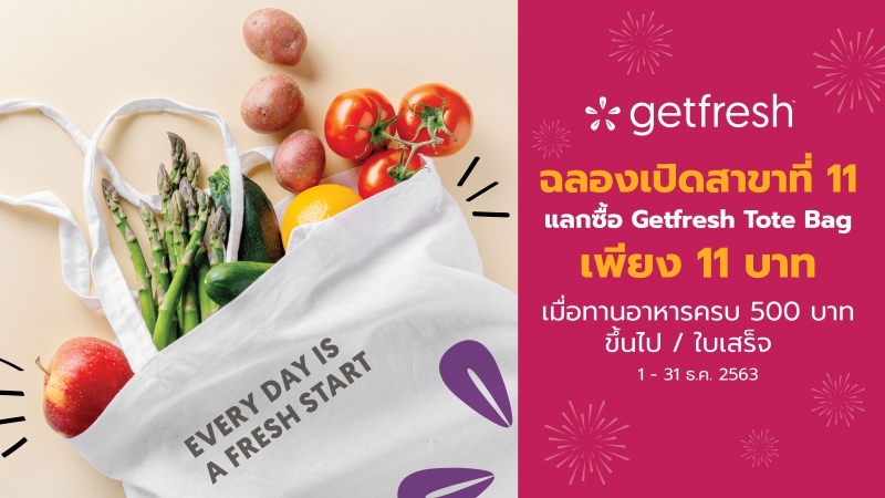 และนอกจากนี้ ยังสามารถแลกซื้อกระเป๋าผ้า Getfresh Tote Bag ในราคาเพียง 11 บาท เมื่อทานอาหารครบ 500 บาทขึ้นไป โปรโมชั่นนี้มีถึงวันที่ 31 ธันวาคม 2563 เท่านั้น