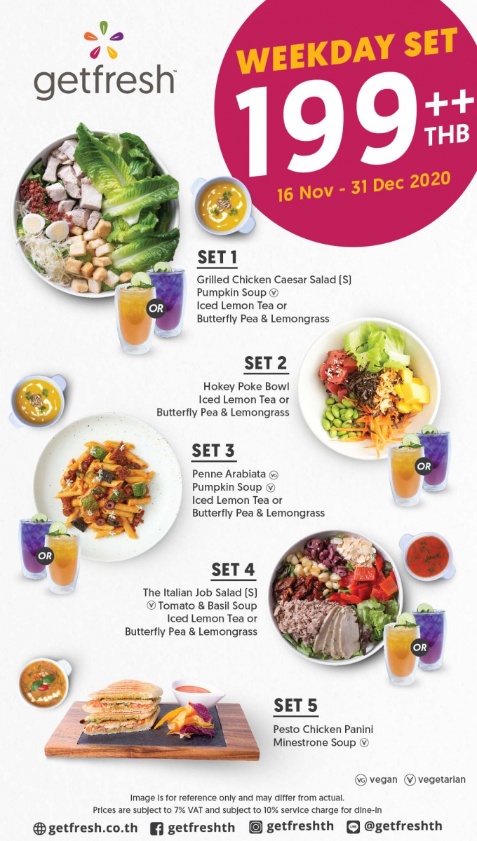 ร้าน Getfresh มีโปรโมชั่นเอาใจคนรักสุขภาพ ด้วยโปรฯ Weekday Set ราคาเพียง 199 บาท มีเซ็ตให้เลือกถึง 5 เซ็ตตามความชอบ รับรองว่าอร่อย คุ้มค่าและได้สุขภาพที่ดีแน่นอน