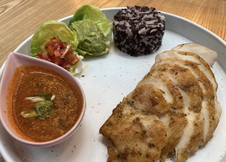 5. Cajun Chicken Steak (Signature Menu) sous-vide cajun chicken breast, smashed avocado and tomato salsa served with organic jasberry rice and cajun-spiced sauce