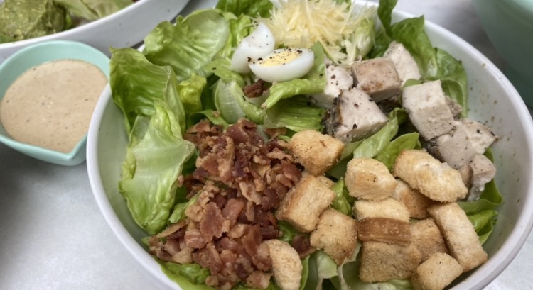 6. Grilled Chicken Caesar (Signature Menu) romaine, grilled chicken, bacon bits, organic quail egg, parmesan cheese and Caesar dressing