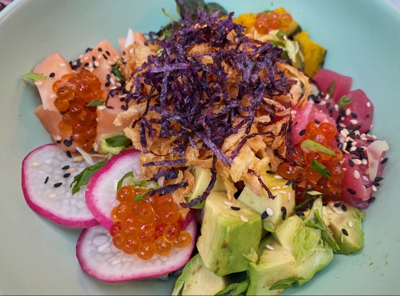 3. Tokyo Bowl (Signature Menu) sashimi-grade tuna, raw salmon, salmon roe, spring onion, fried shallots, nori seaweed, avocado, Japanese pumpkin, baby reddish, Japanese soy vinaigrette served over organic jasberry rice