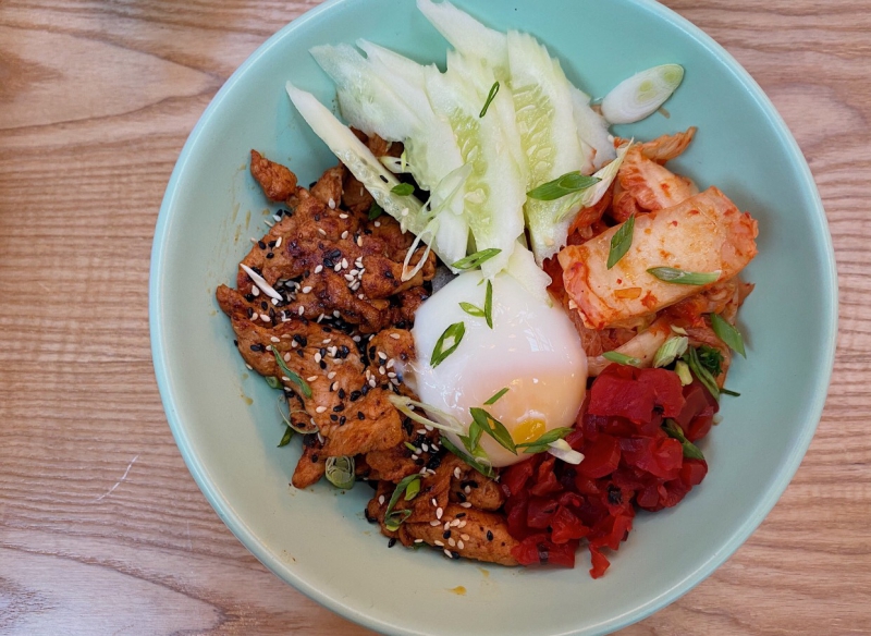 2. Spicy Pork Bulgogi Bowl korean-spiced pork tenderloin, kimchi, pickled daikon, sesame-carrots, baby raddish, spring onion, organic onsen eggserved over organic jasberry rice