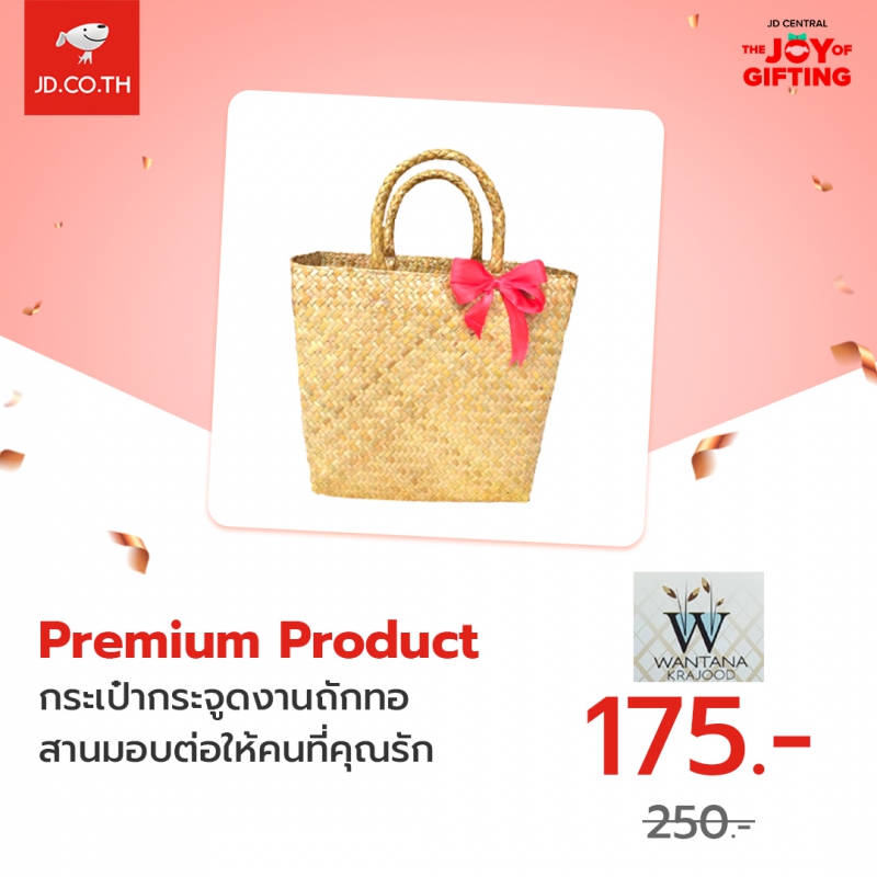 ขึ้นรูปเป็นกระเป๋า มีลวดลายงดงาม สามารถนำไปใช้ใส่ของต่างๆ เมื่อช้อปปิ้ง หรือจ่ายตลาด ทดแทนการใช้ถุงพลาสติก เป็นมิตรกับสิ่งแวดล้อม ตอบโจทย์ยุคอีโคไลฟ์สไตล์ จากราคาปกติ 250 บาท ลดพิเศษเหลือเพียง 175 บาท