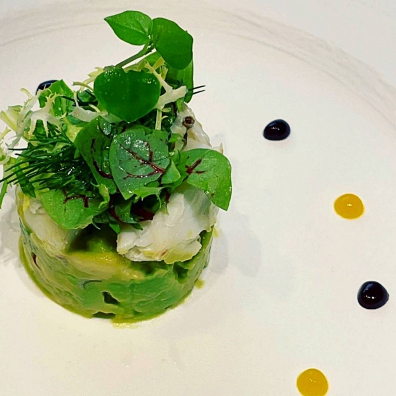ยำเนื้อปูม้ากับอโวคาโดและสมุนไพรสด ปลาเก๋าแดงทอดข้าวคั่วน้ำปลาหวานกับสะเดา และ ไอศกรีมโยเกิร์ตมะกรูดเชื่อมและส้มโอ