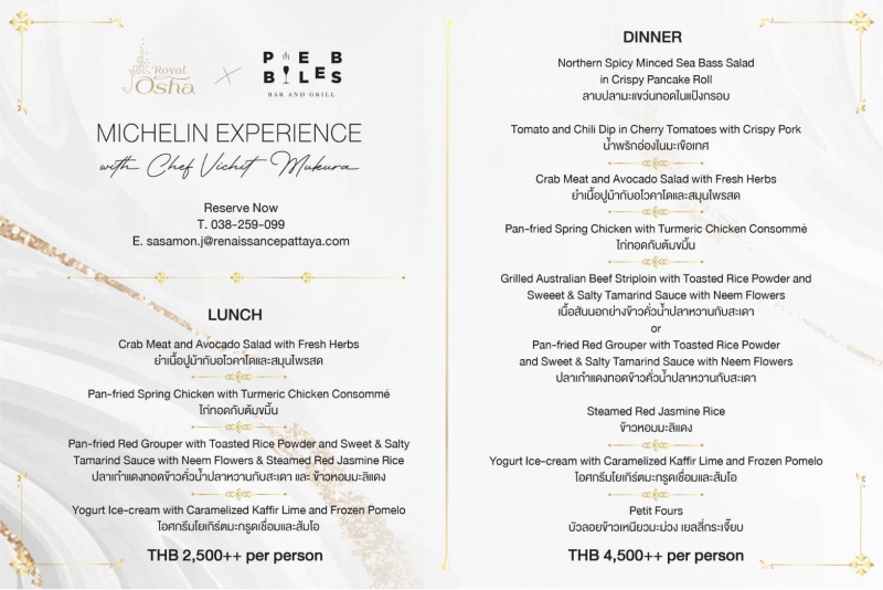 มาเพื่อชาวพัทยา ณ ห้องอาหารเพบเบิลส์ บาร์ แอนด์ กริลล์ ภายในโรงแรมเรเนซองส์ พัทยา รีสอร์ท แอนด์ สปา ที่เชฟวิชิต จะมาปรุงอาหารด้วยตนเองทั้ง มื้อกลาง และ มื้อเย็น พร้อมนำเสนอเมนูอาหารไทยสไตล์โมเดิร์น ไฮไลท์เมนูเช่น
