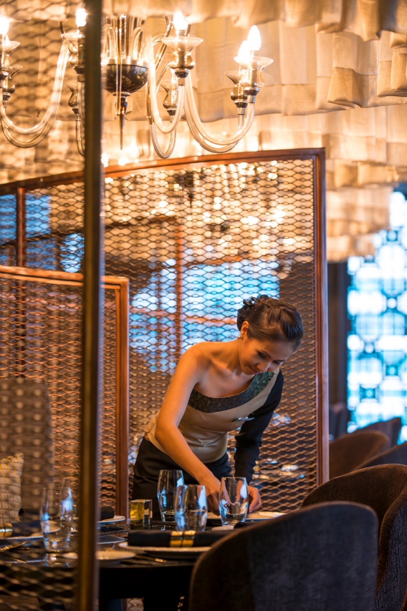 บรรยากาศภายในห้องอาหารเป็นแบบโมเดิร์น ที่ใช้สีดำเป็นสีหลัก จานสีขาว ตัดด้วยสีทองทำให้ดูหรูหรา ผสมลายที่มีความเป็นอินเดียเล็กน้อย มีทั้งโต๊ะเล็ก โต๊ะขนาดใหญ่ รวมไปถึงห้องทาน