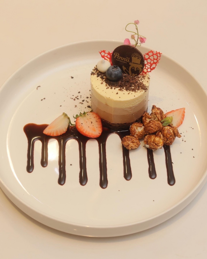 แต่เมื่อทานคู่กับไอศกรีม เฮเซลนัท ที่ทางร้านคิดไว้ว่ารสชาติเข้ากันแน่นอน แต่สำหรับใครที่ต้องการเปลี่ยนรสชาติไอศกรีมก็สามารถเปลี่ยนได้เช่นกัน แล้วก็มีเมนู Mousse เพิ่มเข้ามาเป็นเมนู Tripple Mousses Chocolate ที่จะเน้นความเป็น Layer ของ Chocolate Mousses แต่ละชั้นโดยจะมี White Chocolate, Milk Chocolate และ Dark Chocolate ต้องบอกเลยว่าเมนูนี้สำหรับคนที่ชอบหวานน้อยจริงๆ เพราะใช้ความหวานจากตัว Chocolate Mousses โดยไม่ได้เพิ่มความหวานจากน้ำตาลหรือไซรัป เมื่อทานเมนูนี้ก็จะรู้สึกเบาๆ นุ่มละมุนมากเลยค่ะ”