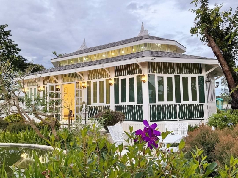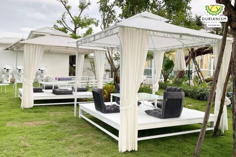 นอกจากสารพัดเมนูที่เสริฟมาแบบสวยงามแล้ว ทางร้านก็สวยไม่แพ้กันร้านทุเรียนคาเฟ่เชียงราย เป็นร้านสีขาว สไตล์อังกฤษโคโลเนี่ยน (Colonial Style) มีที่นั่งให้เลือกหลากหลายโซนทั้ง indoor และ outdoor ที่ล้อมรอบไปด้วยสวนสไตล์อังกฤษ