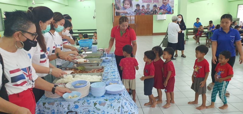 โดยมี ดร.จินดารัตน์-รัสรินทร์ (โอบอุ้ม) ชุมสาย ณอยุธยา,ศรีสองรัก ชัยสิทธิ์ เลขาธิการ สมาคม, เอิร์ธ สายสว่าง ช่วยกันแจกอาหารให้กับเด็กๆร่วมร้อย กว่าชีวิต