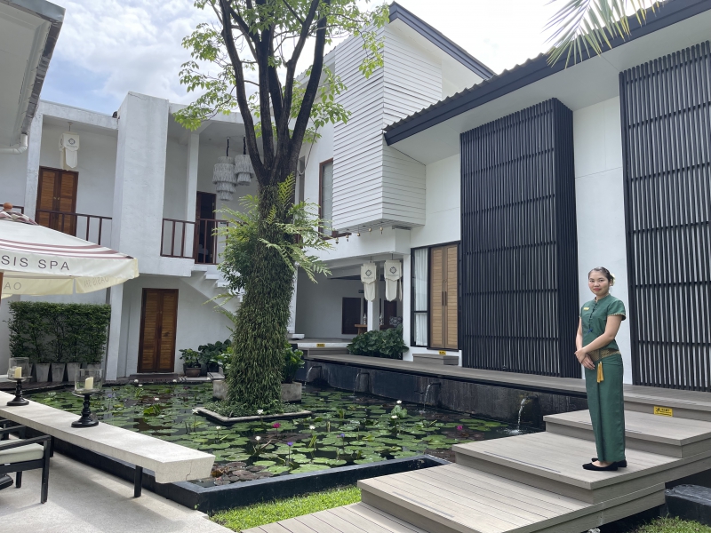 ต้นไม้ใหญ่ให้ร่มเงา สร้างความรู้สึกสงบและใกล้ชิดธรรมชาติ อาคารสปามีการออกแบบที่ทันสมัย ผสมผสาน