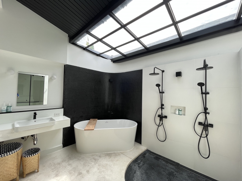ระหว่างสไตล์โมเดิร์นและเอเชีย ใช้โทนสีขาวสะอาดตามีสระบัวขนาดใหญ่ตรงกลาง เพิ่มความสดชื่น