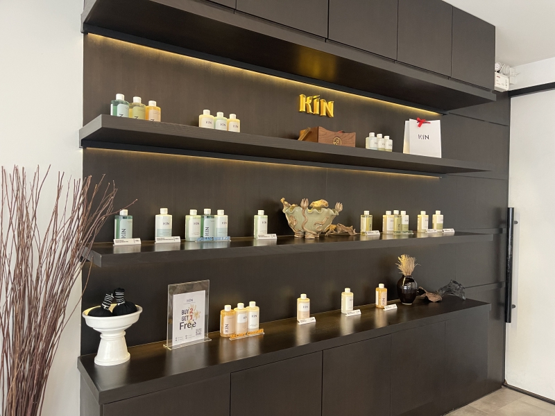 ผลิตภัณฑ์ที่ใช้ในสปานั้นเป็นของแบรนด์ KIN ซึ่งเป็นผลิตภัณฑ์ที่มีคุณภาพสูงและได้รับการคัดสรรมาอย่างดี โดยผลิตภัณฑ์ทุกชิ้นได้รับการจัดวางอย่างสวยงามบนชั้นไม้ที่ออกแบบมาอย่างลงตัว
