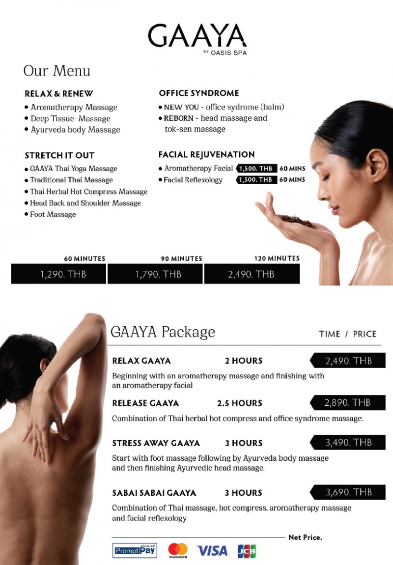 ไปจนถึงแพ็คเกจที่ใช้เวลานาน 3 ชั่วโมงในราคา 3,690 บาท เช่น Relax Gaaya (2 ชั่วโมง) ในราคา 2,490 บาท,