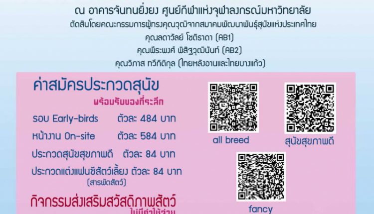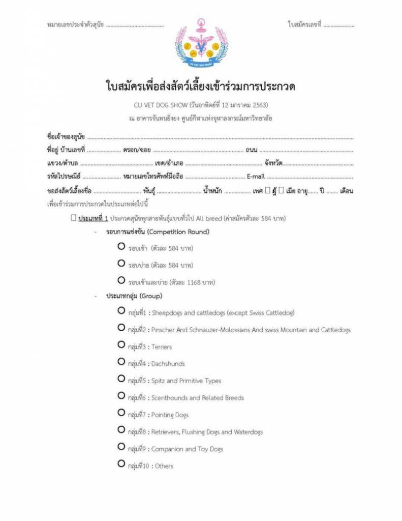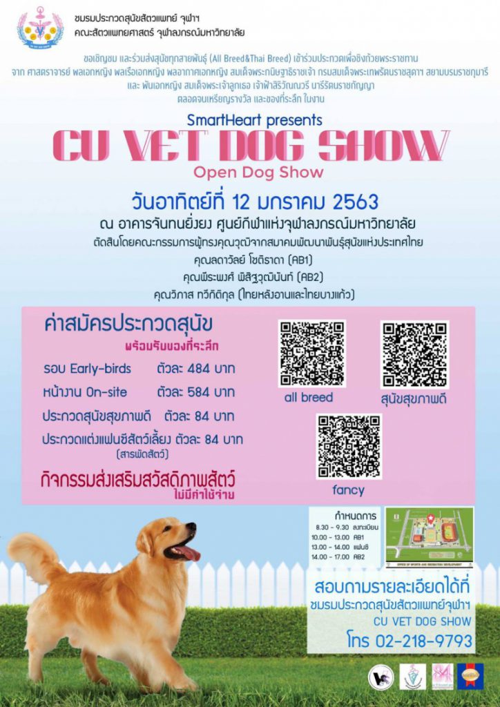 คณะสัตวแพทยศาสตร์ จุฬาลงกรณ์มหาวิทยาลัย ร่วมกับสโมสรนิสิต คณะสัตวแพทยศาสตร์ จุฬาลงกรณ์มหาวิทยาลัย ขอเชิญชวนส่งสุนัขทุกสายพันธ์ุ เข้าร่วมประกวดเพื่อชิงถ้วยรางวัลพระราชทาน จาก ศาสตราจารย์ พลเอกหญิง พลเรือเอกหญิง พลอากาศเอกหญิง สมเด็จพระกนิษฐาธิราชเจ้า กรมสมเด็จพระเทพรัตนราชสุดาฯ สยามบรมราชกุมารี และ พันเอกหญิง สมเด็จพระเจ้าลูกเธอ เจ้าฟ้าสิริวัณณวรี นารีรัตนราชกัญญา ตลอดจน โล่รางวัล เหรียญรางวัล และของที่ระลึกมากมาย ในงาน Smart Heart presents CU VET DOG SHOW วันอาทิตย์ที่ 12 มกราคม 2563 ณ อาคารจันทนยิ่งยง ศูนย์กีฬาแห่งจุฬาลงกรณ์มหาวิทยาลัย