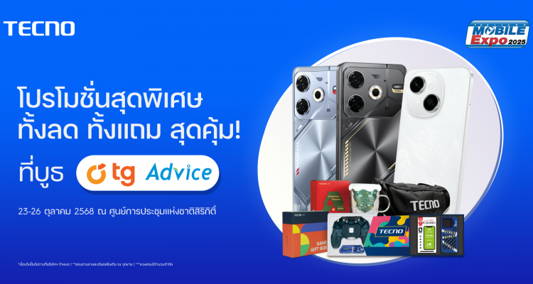 นอกจากนี้ TECNO ยังมี โปรโมชั่นพิเศษภายในงาน Thailand Mobile Expo 2025 ณ บูธ TG และ Advice ไม่ว่าจะเป็น TECNO POVA 6 NEO (ROM 256GB / RAM 8GB + เพิ่มได้อีก 8GB) จากราคาปกติ 4,999 บาท เหลือเพียง 4,287 บาท ลดทันที 712 บาท พร้อมของแถมมูลค่ารวมกว่า 1,700 บาท ไม่ว่าจะเป็น Premium Game Gift Box มูลค่า 699 บาท, Christmas Cup Gift Box TECNO มูลค่า 459 บาท, TECNO Barrel-type Handbag มูลค่า 559 บาท