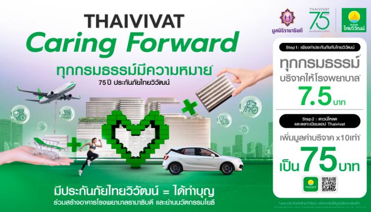 และในโอกาสก้าวสู่ปีที่ 75 บริษัทยังได้ริเริ่มแคมเปญเพื่อส่งต่อพลังแห่งการดูแลสังคม ผ่านแคมเปญ “ทุกกรมธรรม์มีความหมาย” ที่ขยายให้กับลูกค้ากรมธรรม์ประกันภัยทุกประเภท ที่มีค่าเบี้ยสุทธิตั้งแต่ 1,000 บาทขึ้นไป ให้ได้มีส่วนร่วมในการช่วยเหลือสังคม เพียงลูกค้าซื้อหรือมีกรมธรรม์กับประกันภัยไทยวิวัฒน์ ทุกกรมธรรม์ บริษัทฯจะบริจาคเงินจำนวน 7.5 บาท ให้กับมูลนิธิรามาธิบดีฯ โครงการอาคารโรงพยาบาลรามาธิบดีและย่านนวัตกรรมโยธี เพื่อทดแทนอาคารเดิมที่ให้บริการมากว่า 50 ปี ซึ่งมีสภาพทรุดโทรมและไม่เพียงพอต่อการรองรับผู้ป่วย โดยอาคารใหม่นี้ ยังมีเป้าหมายในการเพิ่มศักยภาพการรักษาโรคซับซ้อน รวมถึงยกระดับคุณภาพบริการทางการแพทย์ให้ได้มาตรฐานสากล พร้อมรองรับสถานการณ์สุขภาพในอนาคตและการก้าวสู่ประชาคมอาเซียน ซึ่งจะถูกออกแบบเพื่อเป็นต้นแบบของนวัตกรรมการแพทย์และศูนย์กลางสุขภาพแห่งอนาคตของไทย ที่มีพื้นที่ใช้สอยรวมกว่า 278,000 ตารางเมตร สูง 25 ชั้น นอกจากนี้ลูกค้าประกันภัยไทยวิวัฒน์ยังสามารถเพิ่มมูลค่ายอดเงินบริจาคได้ถึง 10 เท่า จาก 7.5 บาท ให้เป็น 75 บาท เพียงดาวน์โหลด แอปพลิเคชัน Thaivivat ลงทะเบียนใช้งานสำเร็จ