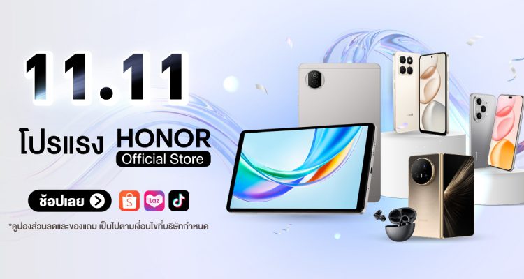 โปรแรง! ‘HONOR Official Store x 11.11 ดีลลดหนัก’ ขนทัพสินค้าลดสูงสุด 62% โค้ดลดเพิ่ม 3,000 บาท พร้อมของแถมเพียบ เริ่ม 7 พ.ย.68 นี้