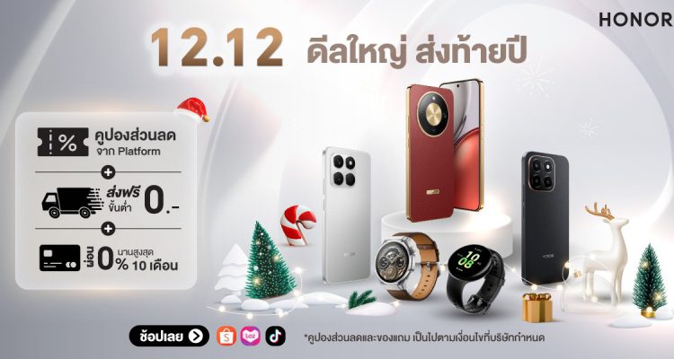 11 ธันวาคม 2568, กรุงเทพฯ – ออเนอร์ (HONOR) ยกขบวนสมาร์ตโฟนและแท็บเล็ตรุ่นขายดีมาลดแบบจัดหนักในแคมเปญ ‘HONOR Official Store x 12.12 ดีลใหญ่ ส่งท้ายปี’ ทั้งน้องใหม่มาแรงอย่าง HONOR X9d 5G ไปจนถึงรุ่นยอดนิยม อาทิ HONOR 400 Series, HONOR X9c 5G, HONOR X7d 5G, HONOR Pad X7, HONOR Pad X9a LTE, HONOR Pad X8a WiFi และอีกหลายรุ่นที่พร้อมให้แฟน ๆ ช้อปแบบสุดคุ้มยิ่งกว่าทุกครั้ง ซึ่งนักช้อปจะได้พบกับความคุ้มแบบจัดเต็มด้วยส่วนลดสูงสุด 56% เสริมทัพดีลแรงด้วยโค้ดส่วนลดเพิ่มสูงสุด 3,000 บาท ผ่อนสบาย 0% นานสูงสุด 10 เดือน* และรับของสมนาคุณสุดพรีเมียมอีกมากมายในทุกออเดอร์