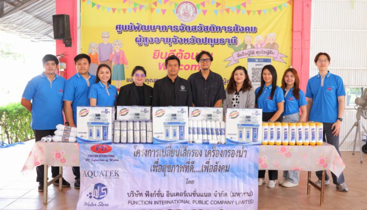 ทีมการตลาดและประชาสัมพันธ์ บริษัท ฟังก์ชั่น อินเตอร์เนชั่นแนล จำกัด (มหาชน) หรือ FTI พร้อมด้วยทีมงาน ลงพื้นที่เปลี่ยนชุดเครื่องกรองน้ำดื่ม เพื่อยกระดับมาตรฐานน้ำดื่มให้สะอาด ปลอดภัย และเพียงพอต่อการใช้งานของผู้พักอาศัยในศูนย์ฯ ณ ศูนย์พัฒนาการจัดสวัสดิการสังคมผู้สูงอายุจังหวัดปทุมธานี