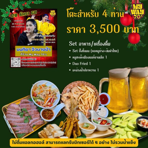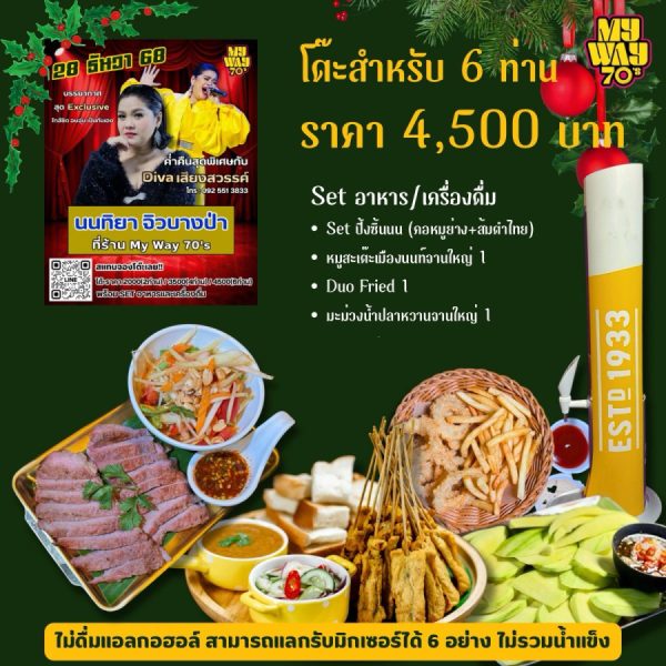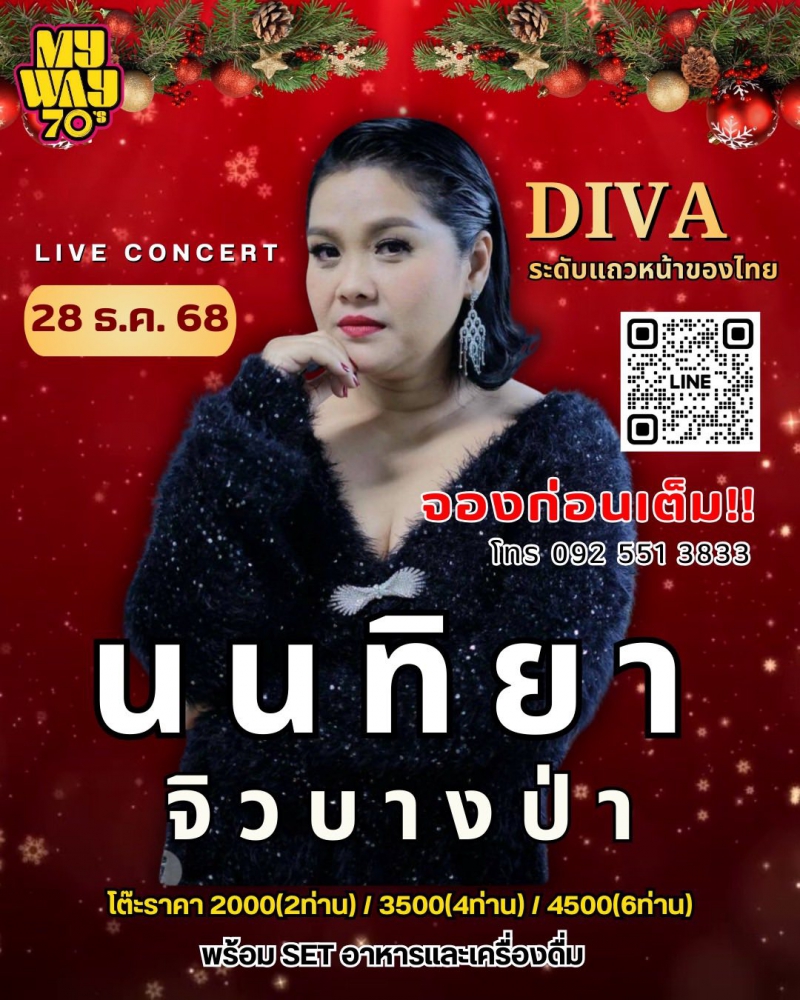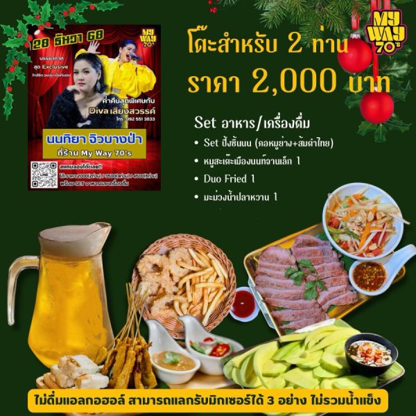 My Way 70’s แลนด์มาร์คแห่งใหม่สำหรับคนรักเพลงยุค 70s ในบรรยากาศสุดวินเทจ 28 ธค. นี้ พบกับ LIVE CONCERT ของ DEVA ระดับแถวหน้าของไทย “นนทิยา จิวบางป่า” จองโต๊ะพร้อมอาหารเซ็ต ราคา 2,000-4,500 บาท นั่ง ที่นั่งมีจำนวนจำกัด รีบจองก่อนโต๊ะหมด