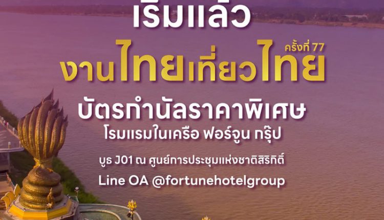 6มีนาคม2569 โรงแรมในเครือ ฟอร์จูน กรุ๊ป ชวนคุณมาสัมผัสประสบการณ์การพักผ่อนระดับคุณภาพในราคาสุดพิเศษ เพื่อกระตุ้นการท่องเที่ยวทั่วไทย พบกันในงาน “ไทยเที่ยวไทย ครั้งที่ 77” ระหว่างวันที่ 5 – 8 มีนาคม 2569 เวลา 10.00 – 20.00 น. ณ บูธ J01 ณ ศูนย์การประชุมแห่งชาติสิริกิติ์ (QSNCC) โดยนำเสนอโปรโมชันห้องพักราคาพิเศษจากโรงแรมในเครือทั่วประเทศ เพื่อส่งเสริมการท่องเที่ยวและมอบทางเลือกการพักผ่อนคุณภาพในราคาคุ้มค่าให้แก่นักท่องเที่ยว