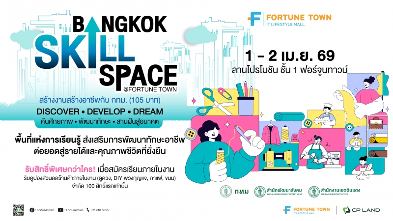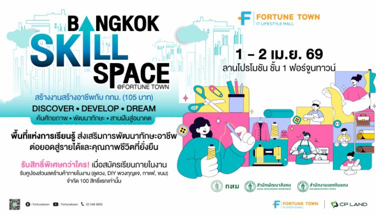 20 มีนาคม 2569, กรุงเทพฯ – ฟอร์จูนทาวน์ (Fortune Town) ศูนย์รวมไอทีและไลฟ์สไตล์ย่านรัชดา–พระราม 9 ร่วมกับ กรุงเทพมหานคร (กทม.) โดยสำนักพัฒนาสังคม โรงเรียนฝึกอาชีพกรุงเทพมหานคร (ดินแดง 1 และ ดินแดง 2) และสำนักงานเขตดินแดง จัดงาน “Bangkok Skill Space @ Fortune Town” สร้างงาน สร้างอาชีพ กับ กทม. (105 บาท) ภายใต้แนวคิด Discover – Develop – Dream เปิดพื้นที่ให้ประชาชนได้เรียนรู้และพัฒนาทักษะอาชีพ ระหว่างวันที่ 1–2 เมษายน 2569 ณ ลานโปรโมชัน ชั้น 1 ฟอร์จูนทาวน์