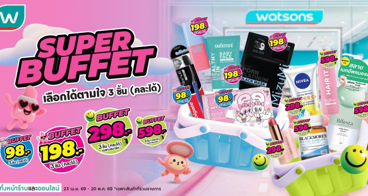 จากความเข้าใจผู้บริโภคอย่างลึกซึ้ง วัตสันจึงเดินหน้าสร้างประสบการณ์ Super Buffet ให้เข้มข้นยิ่งขึ้นภายใต้แนวคิด “คุ้ม คละได้ สนุก” ตั้งแต่วันที่ 23 เมษายน – 20 พฤษภาคม 2569 ที่ร้านวัตสันทุกสาขาและวัตสันออนไลน์ เริ่มต้นที่ 98 บาท และ 198 บาท สำหรับสมาชิกวัตสัน เลือกคุ้มเพิ่มเติมได้ในราคา 298 บาท และ 598 บาท สอบถามข้อมูลเพิ่มเติมได้ที่สื่อประชาสัมพันธ์ ณ จุดขาย หรือ Line Official @WatsonsTH, เว็บไซต์ Watsons.co.th หรือผ่านแอป WatsonsTH ดาวน์โหลดได้ที่ Google Play Store และ App Store