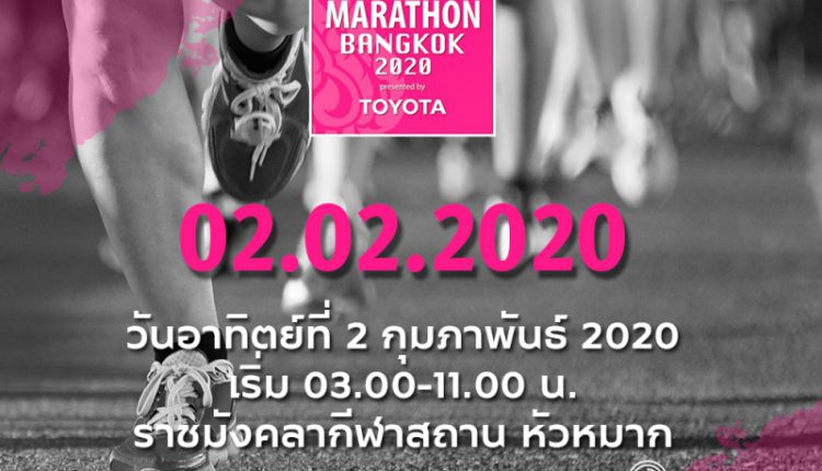กิจกรรม AMAZING THAILAND Marathon Bangkok 2020 เป็นความร่วมมือกันระหว่าง ททท. และบริษัทโตโยต้า จะเป็นการวิ่งผ่าเมือง ใน 4 เส้นทาง ประกอบด้วย ระยะมาราธอน ณ ราชมังคลากีฬาสถาน หัวหมาก , ระยะฮาล์ฟมาราธอน ณ ราชมังคลากีฬาสถาน หัวหมาก , ระยะ BANGKOK BANK 10 กม. ณ บริเวณหน้าโลหะปราสาท ถนนราชดำเนิน และ ระยะ Muang Thai Smile Run 5 กม. ณ บริเวณหน้าโลหะปราสาท ถนนราชดำเนิน นอกจากนี้นักวิ่งและผู้สนใจทุกท่านยังจะได้รับความสุขที่รออยู่ที่เส้นชัย กับการอิ่มอร่อย และช้อปสนุก พร้อมบูธจำหน่ายสินค้ากีฬาในราคาพิเศษให้จับจ่าย โดยพบกับกิจกรรมได้ในวันอาทิตย์ที่ 2 กุมภาพันธ์ พ.ศ. 2563