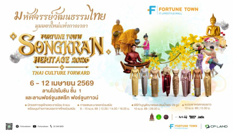 ร่วมสัมผัสประสบการณ์สงกรานต์ที่พิเศษกว่าใครในงาน “Fortune Town Songkran Heritage 2026: Thai Culture Forward” ระหว่างวันที่ 6-12 เมษายน 2569 ณ ฟอร์จูนทาวน์ รัชดา-พระราม 9 เดินทางสะดวกด้วยรถไฟฟ้า MRT สถานีพระราม 9 ทางออกประตู 1